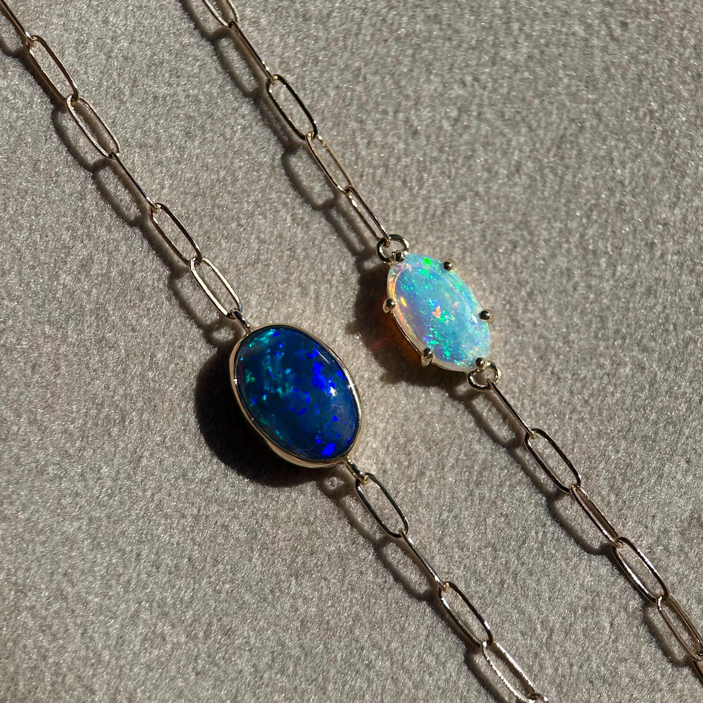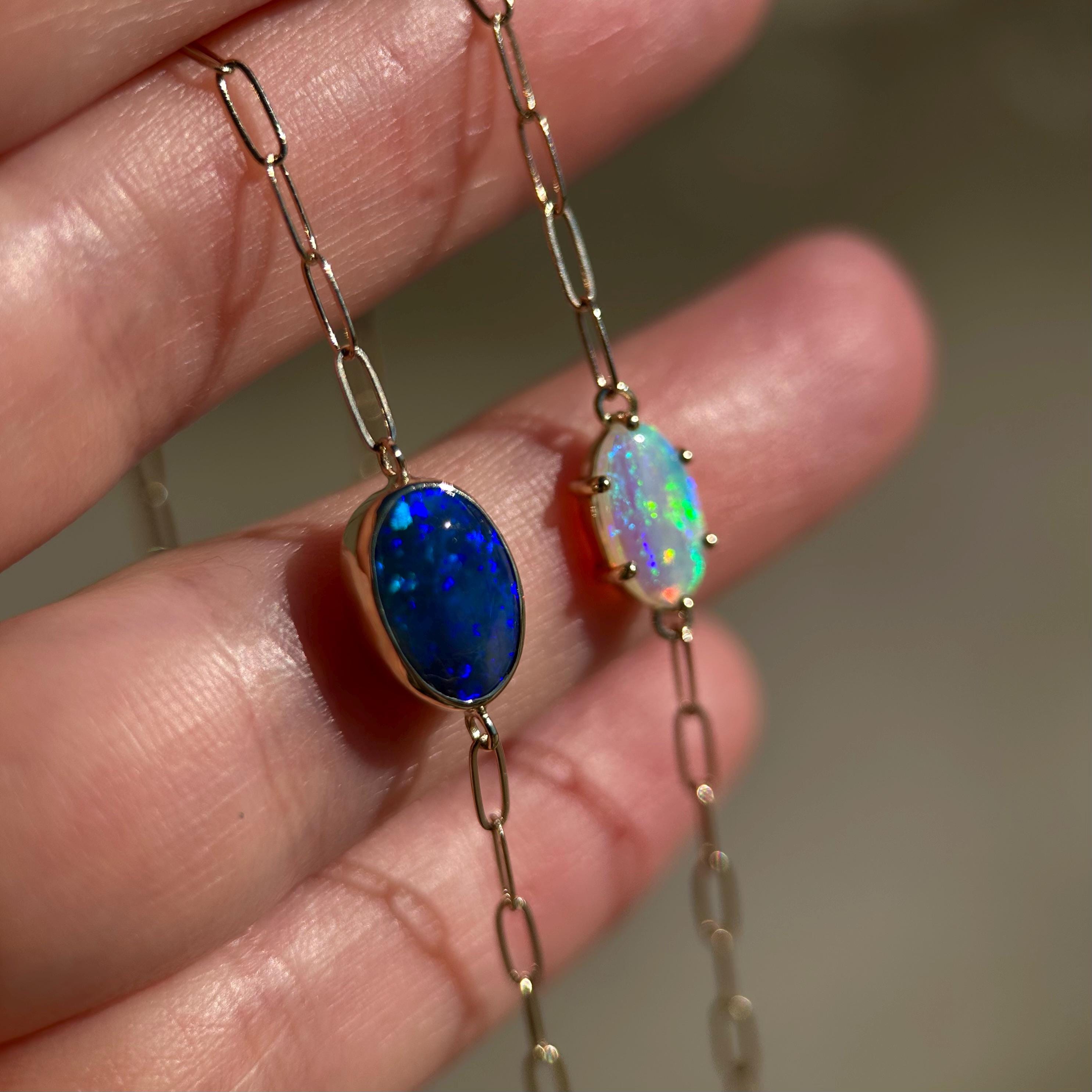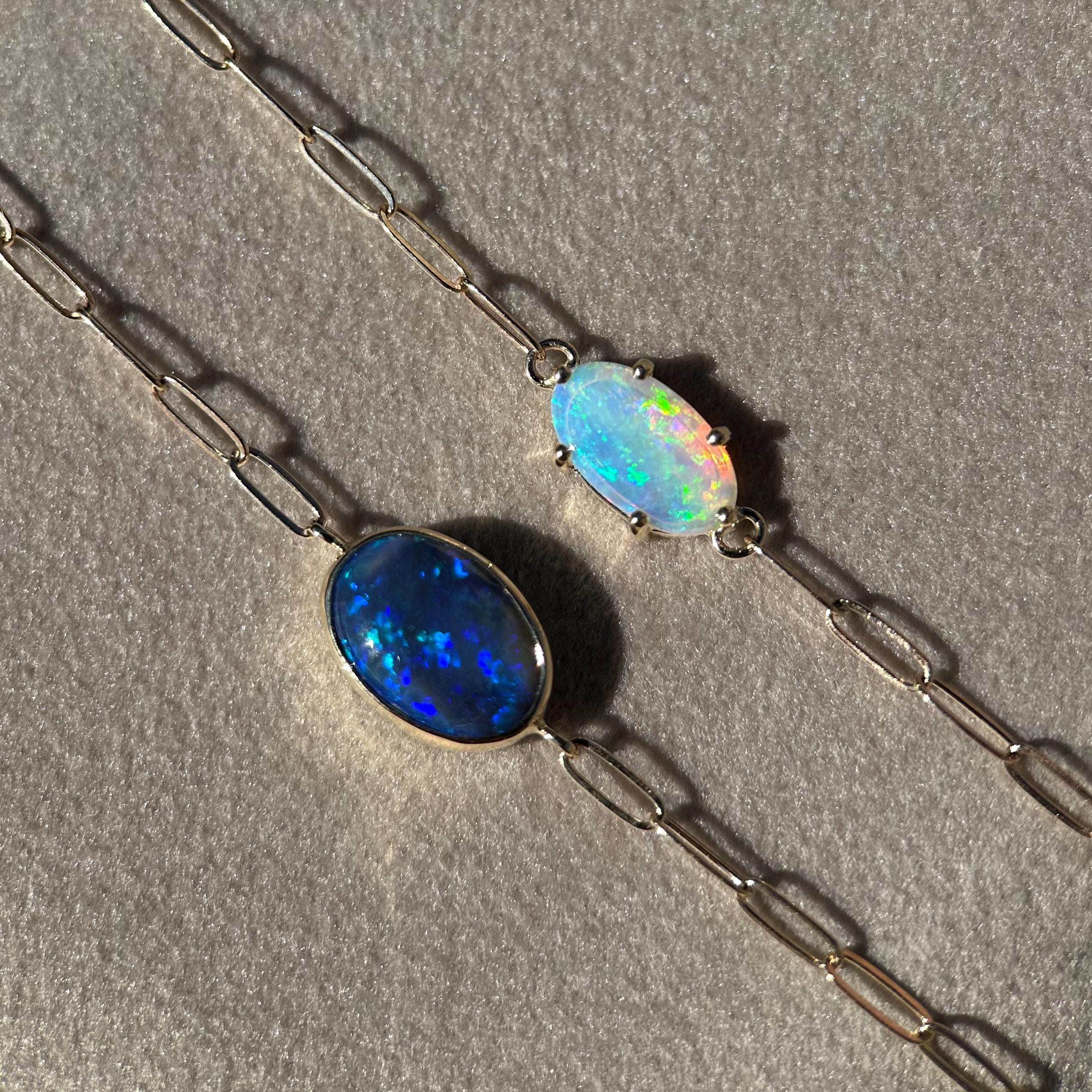 Opal size: black opal – 10×6.8mm (1.5 ct), crystal opal – 9.4×5.4mm (0.85 ct)