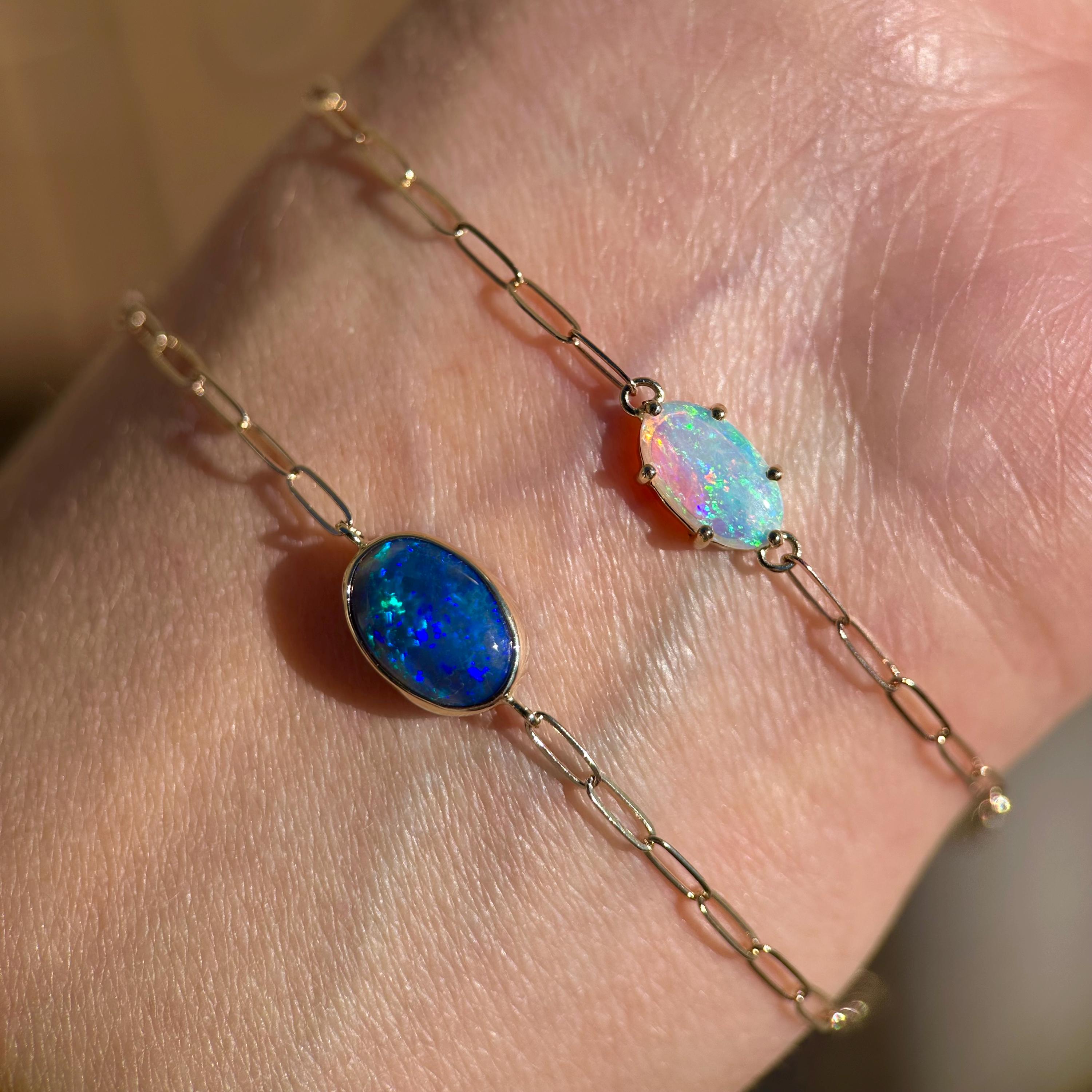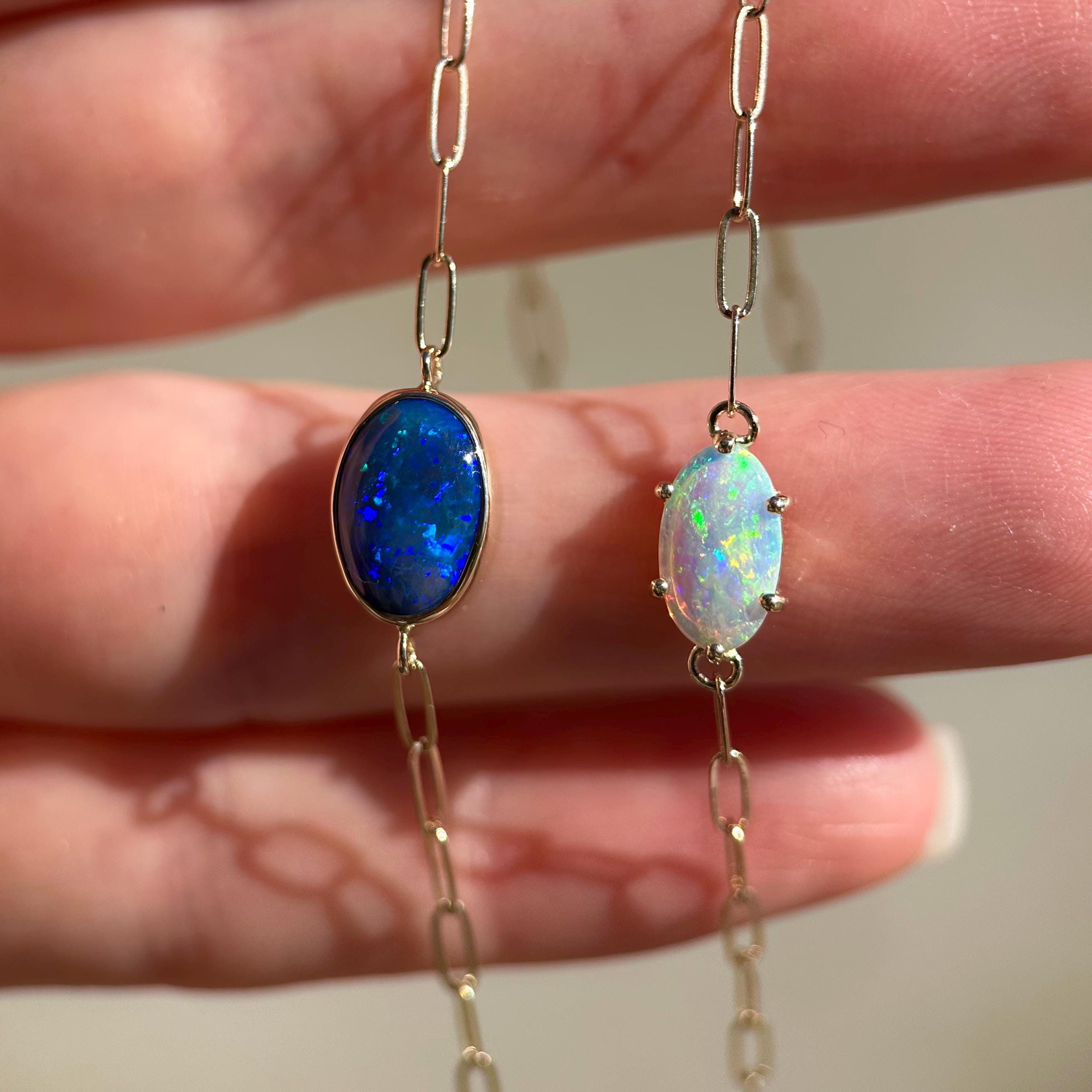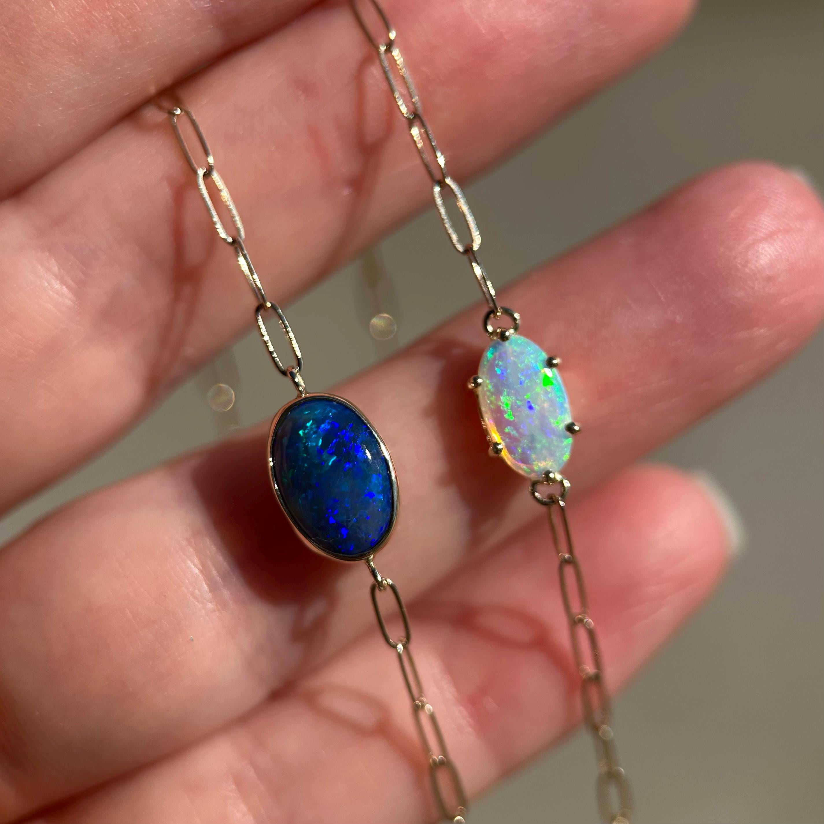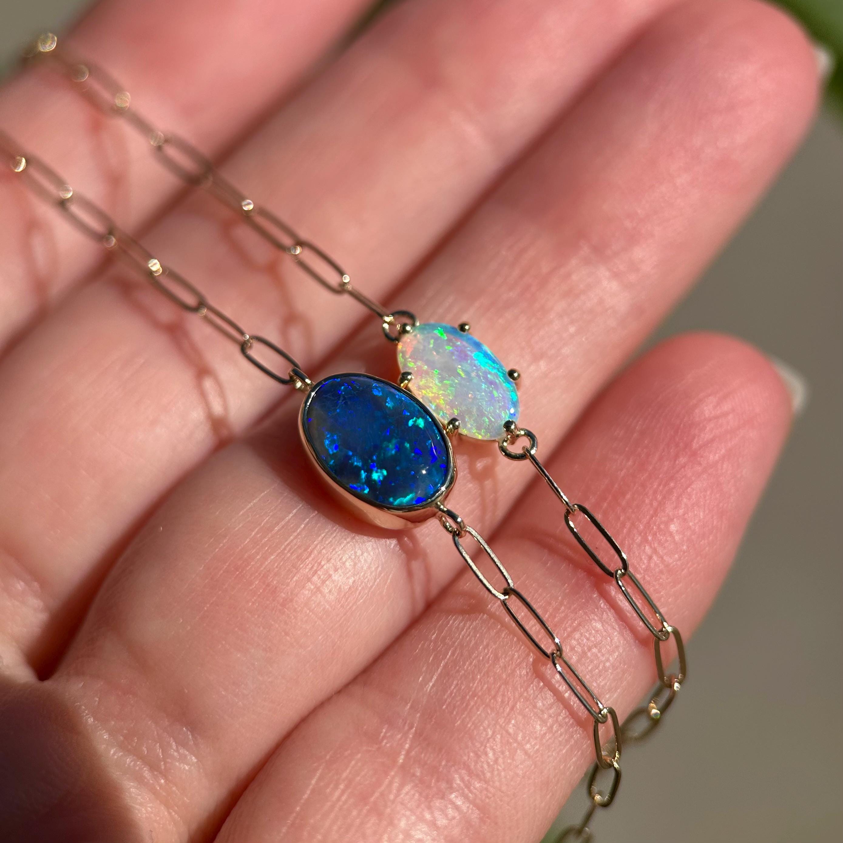 Opal size: black opal – 10×6.8mm (1.5 ct), crystal opal – 9.4×5.4mm (0.85 ct)