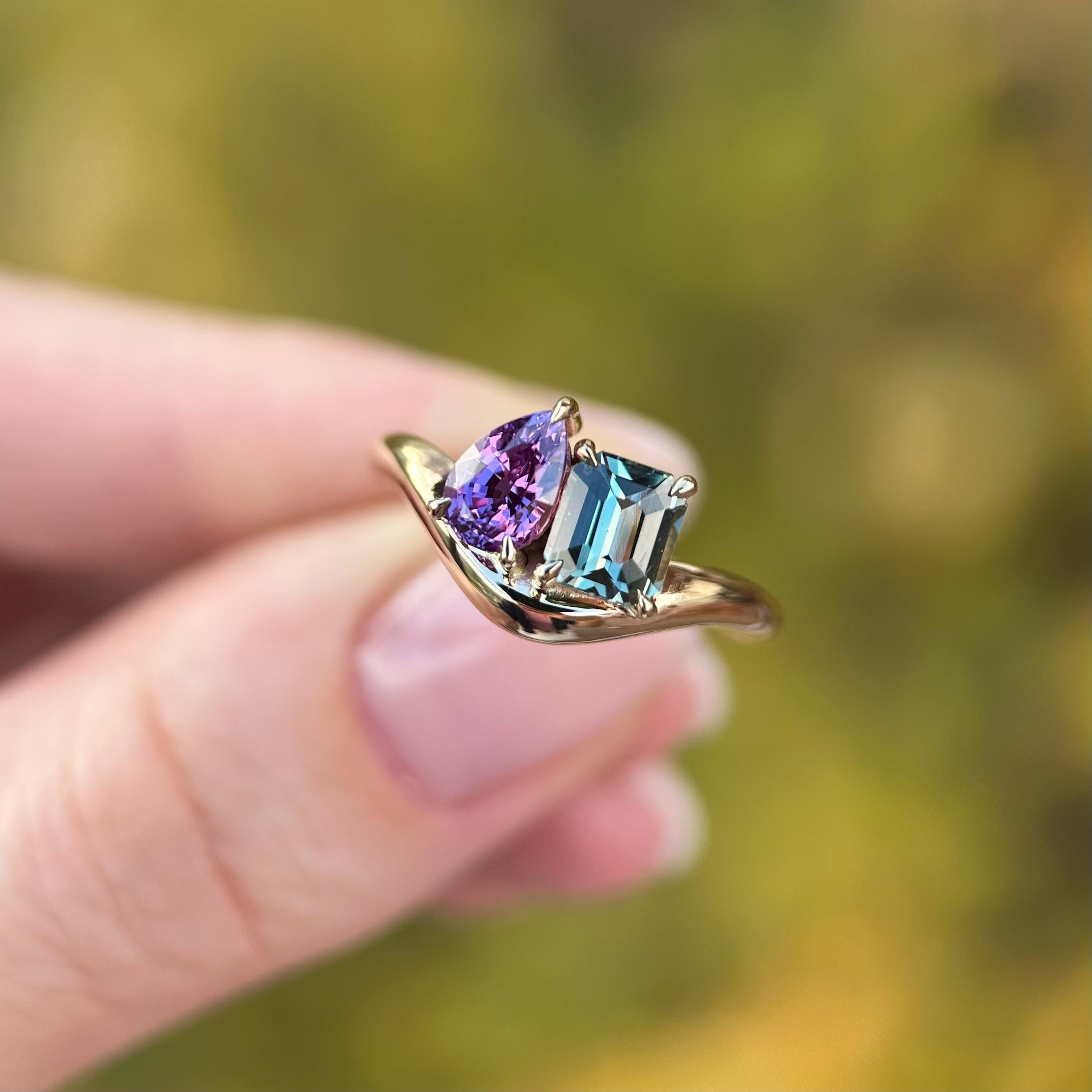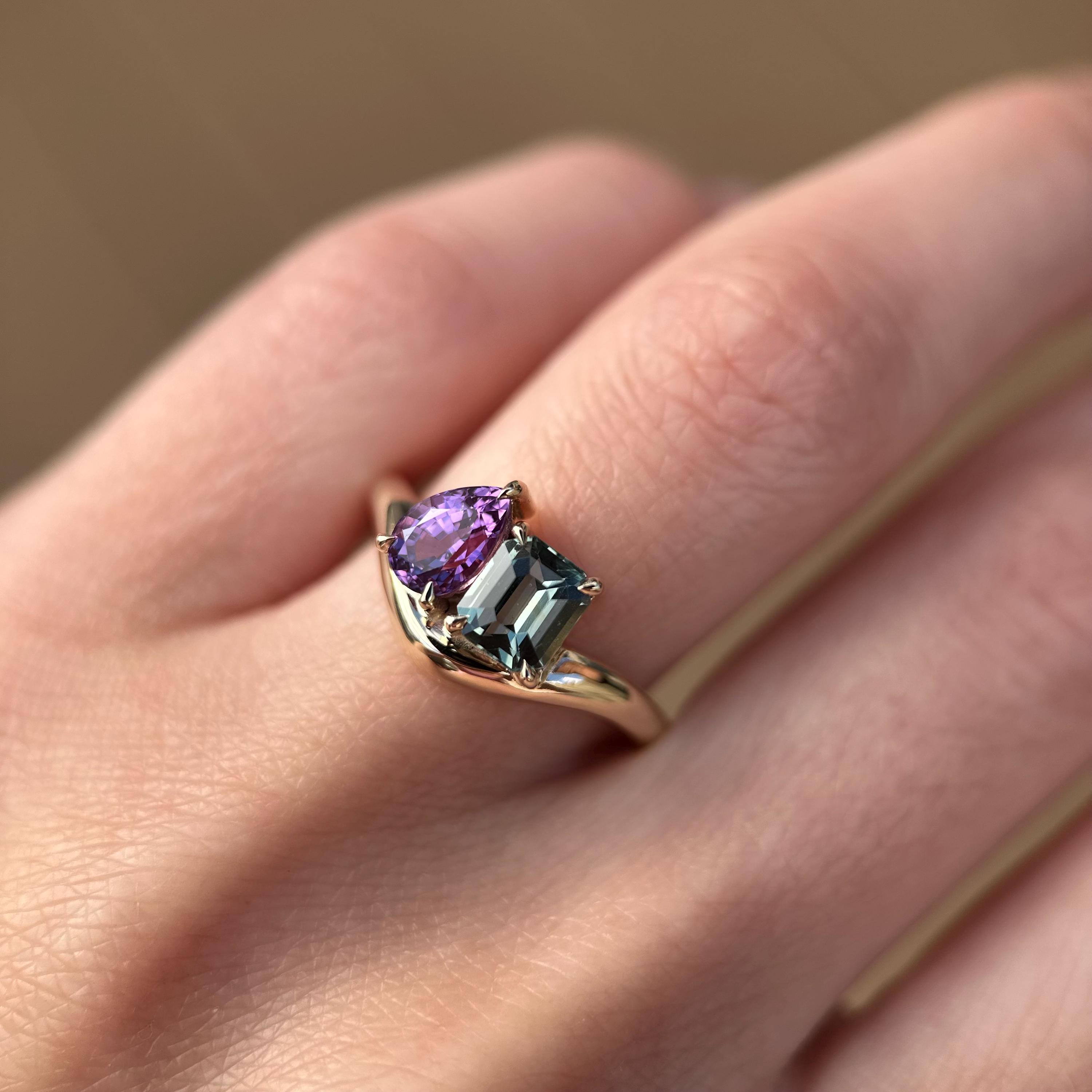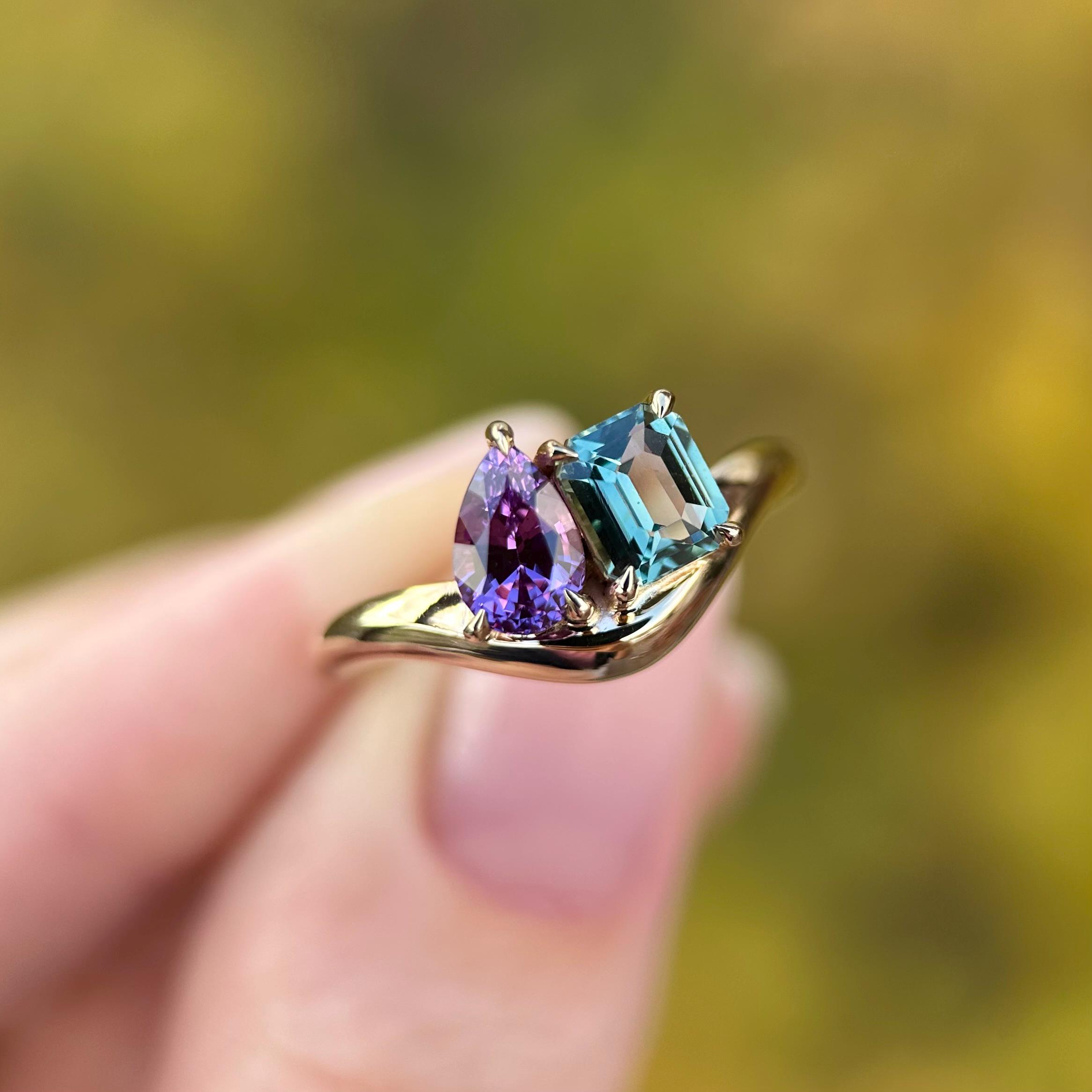 14K Yellow Gold Toi et Moi Caia ring with Purple and Teal Sapphires