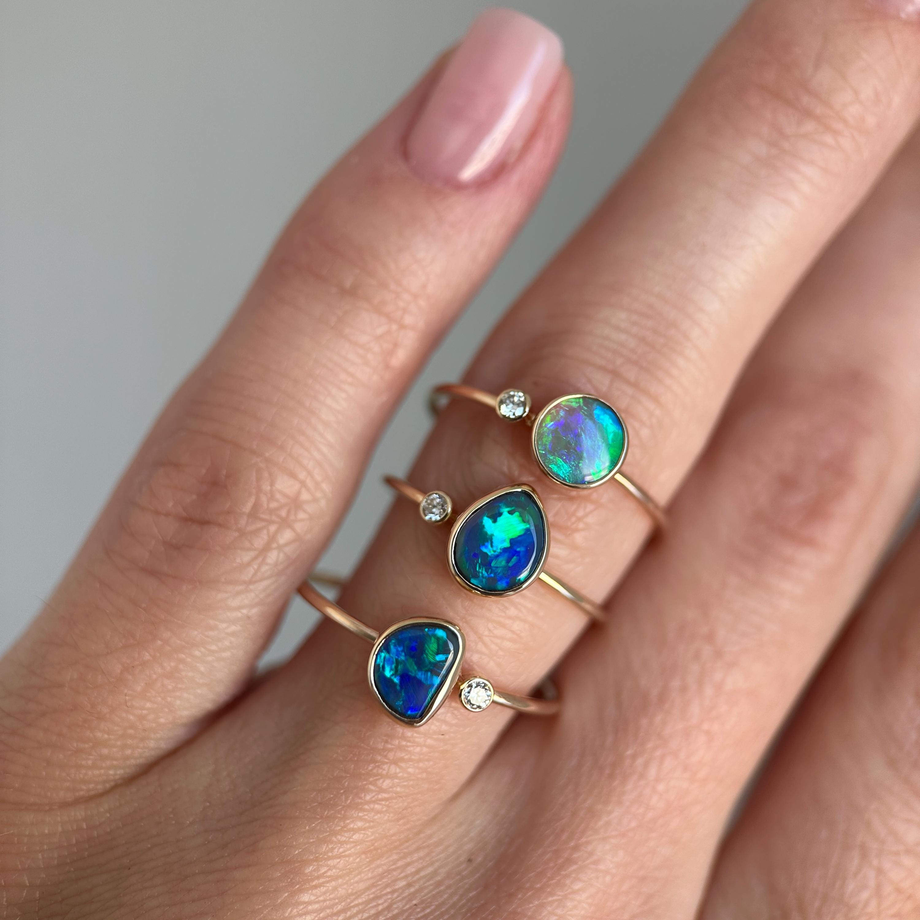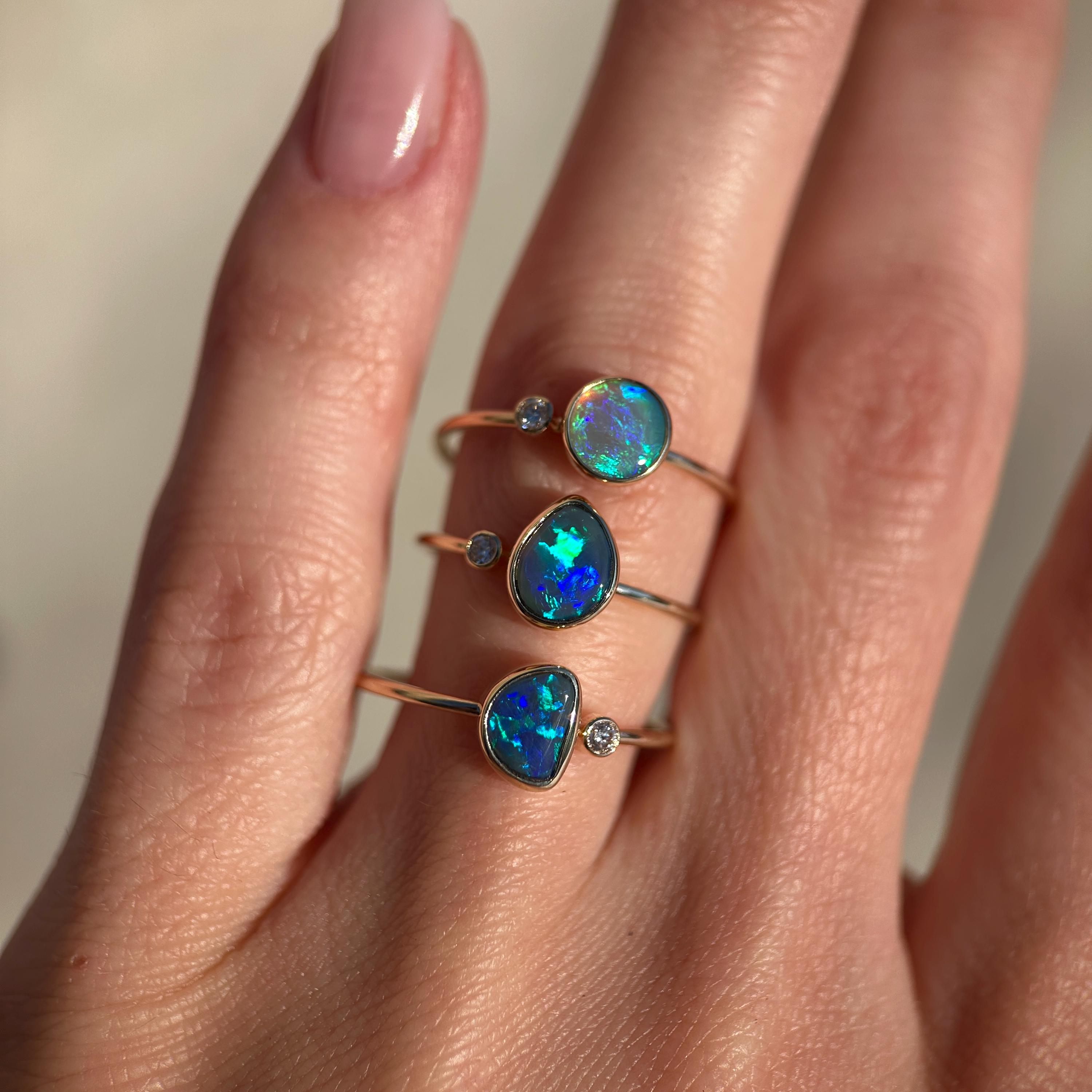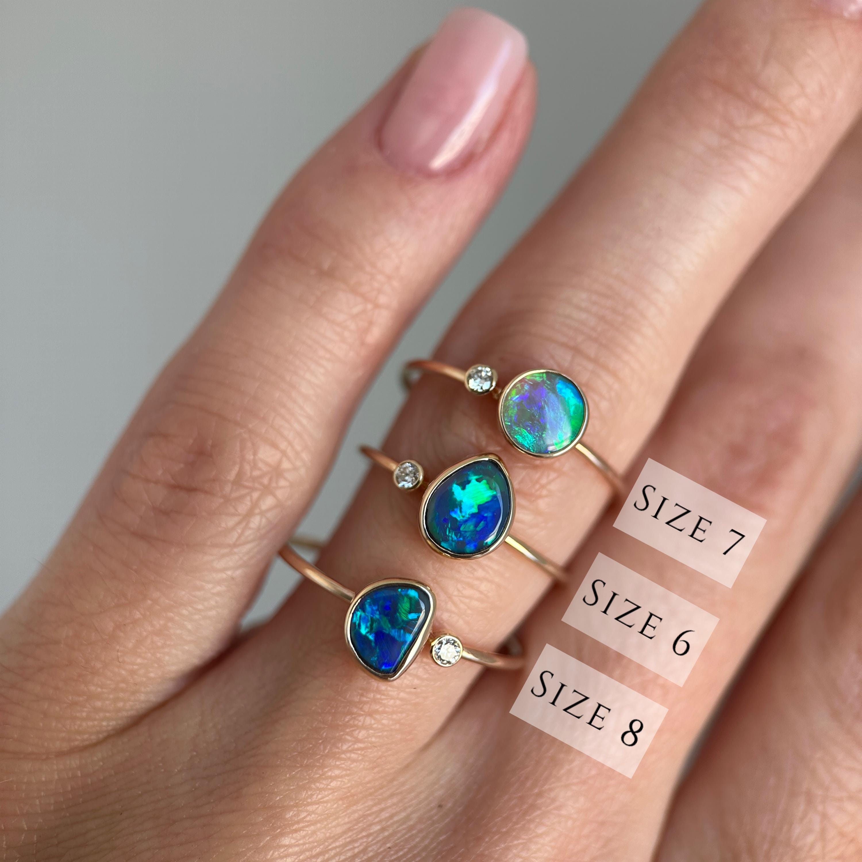 Opal size: SZ 6 – 6.9×5.5mm 0.65 ct; SZ 7 – 6mm 0.4 ct; SZ 8 – 6×4.8mm 0.55 ct