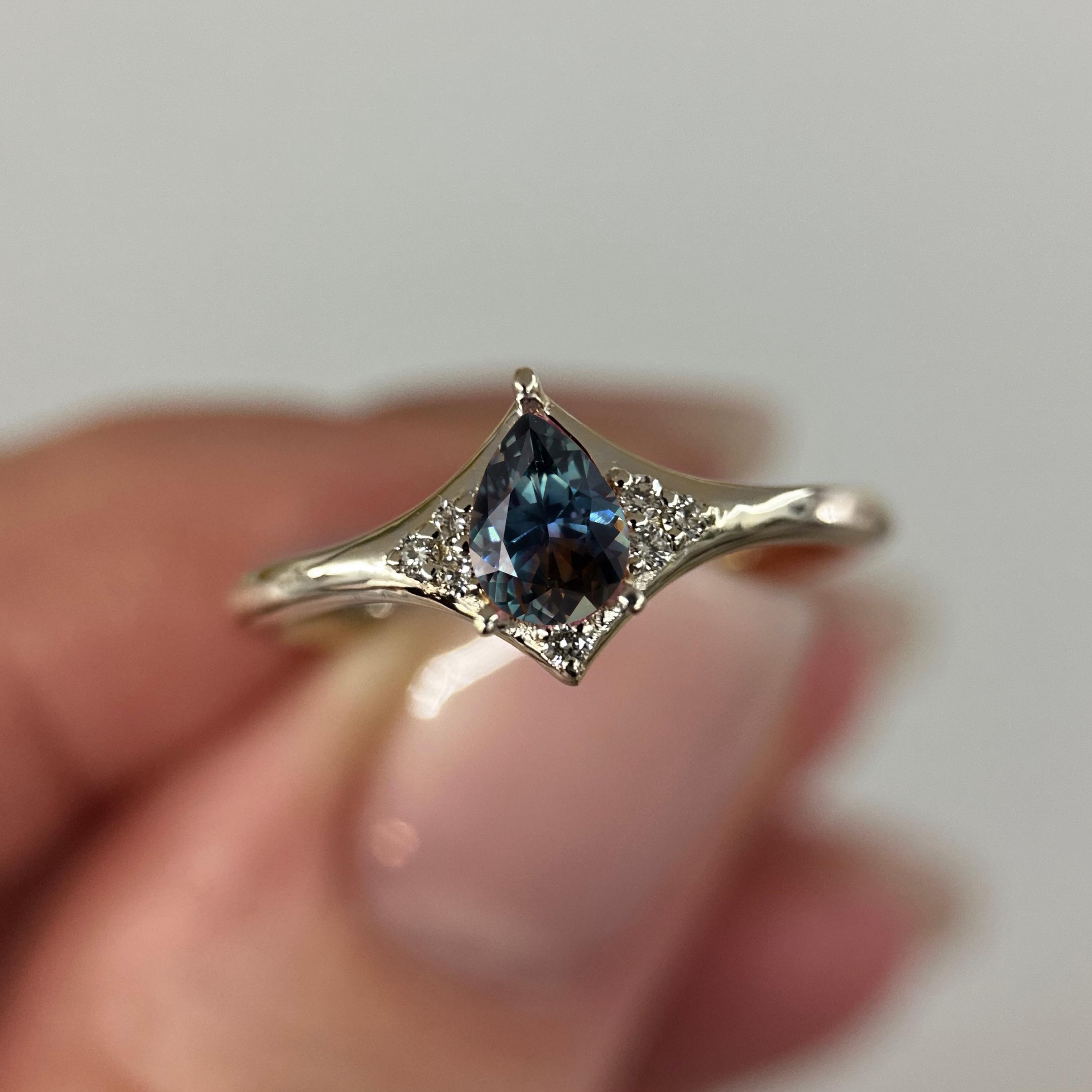 14K White gold ring with Bi-color pear sapphire and diamonds