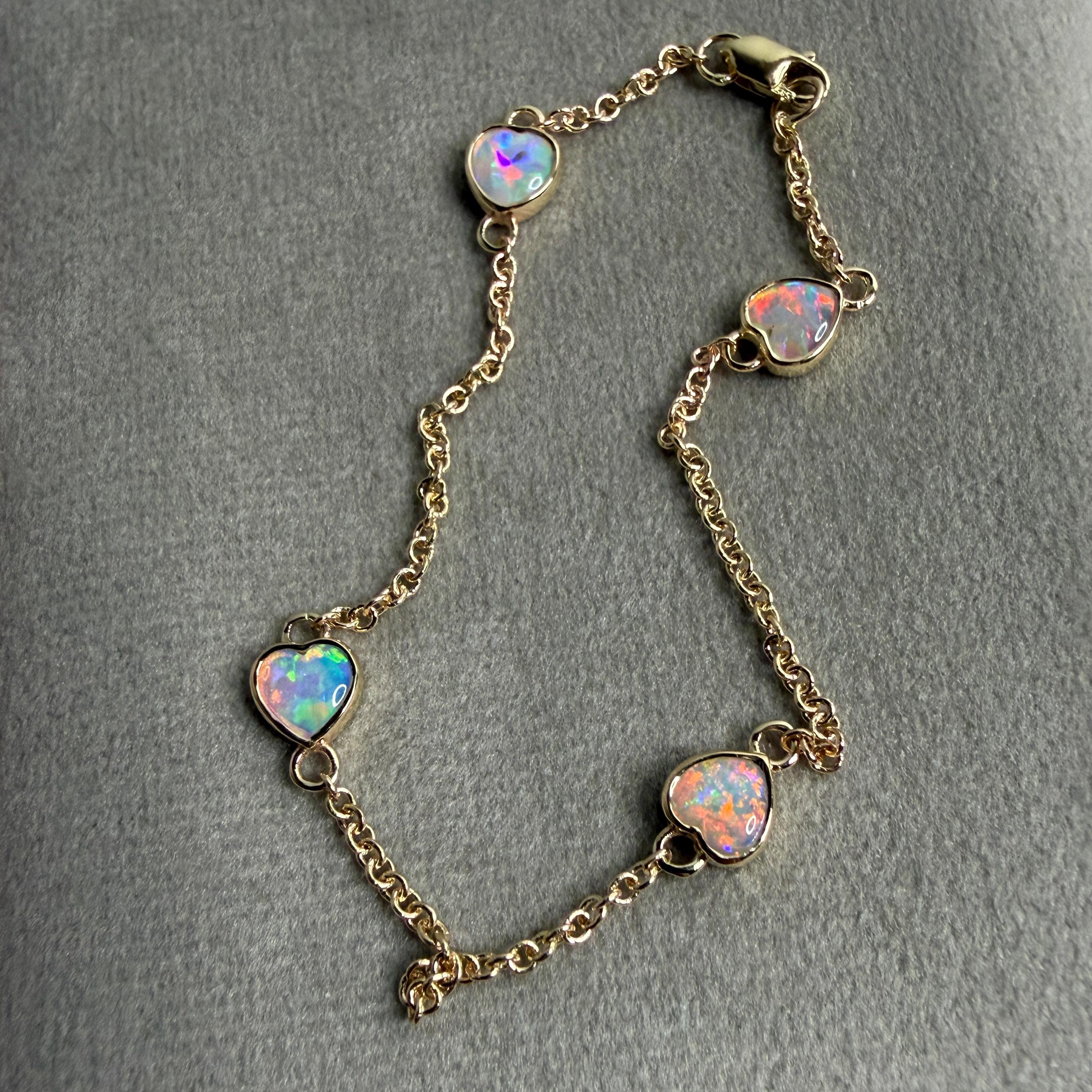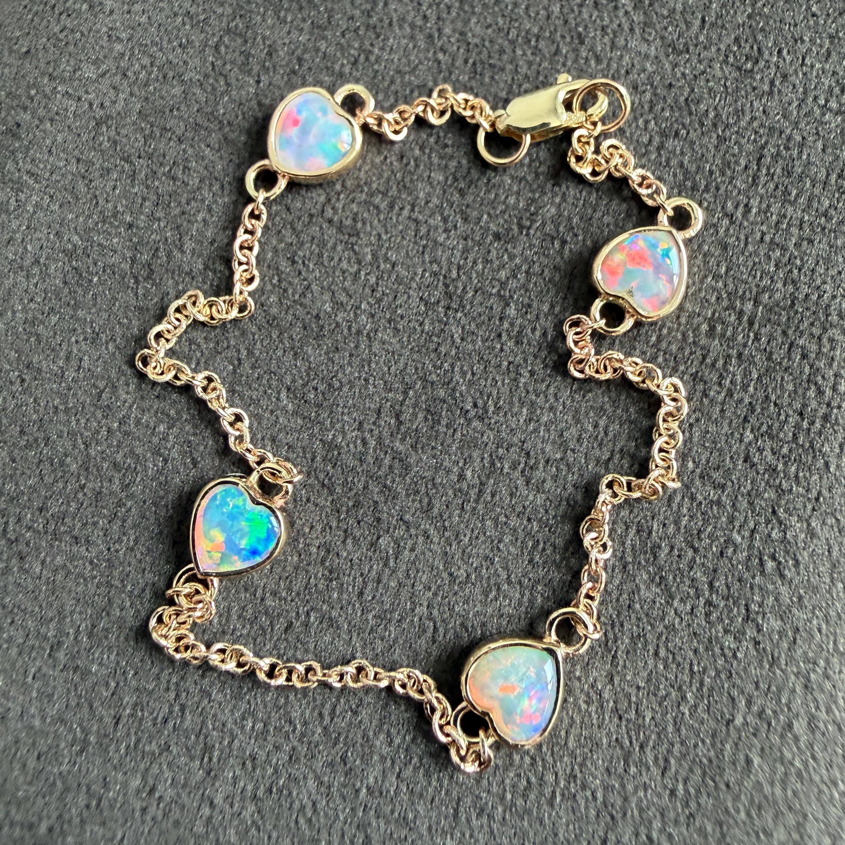 Custom-made 14K Yellow gold bracelet with Australian Crystal Opal Hearts