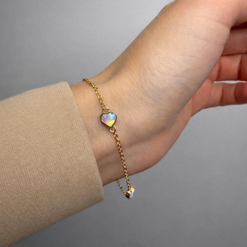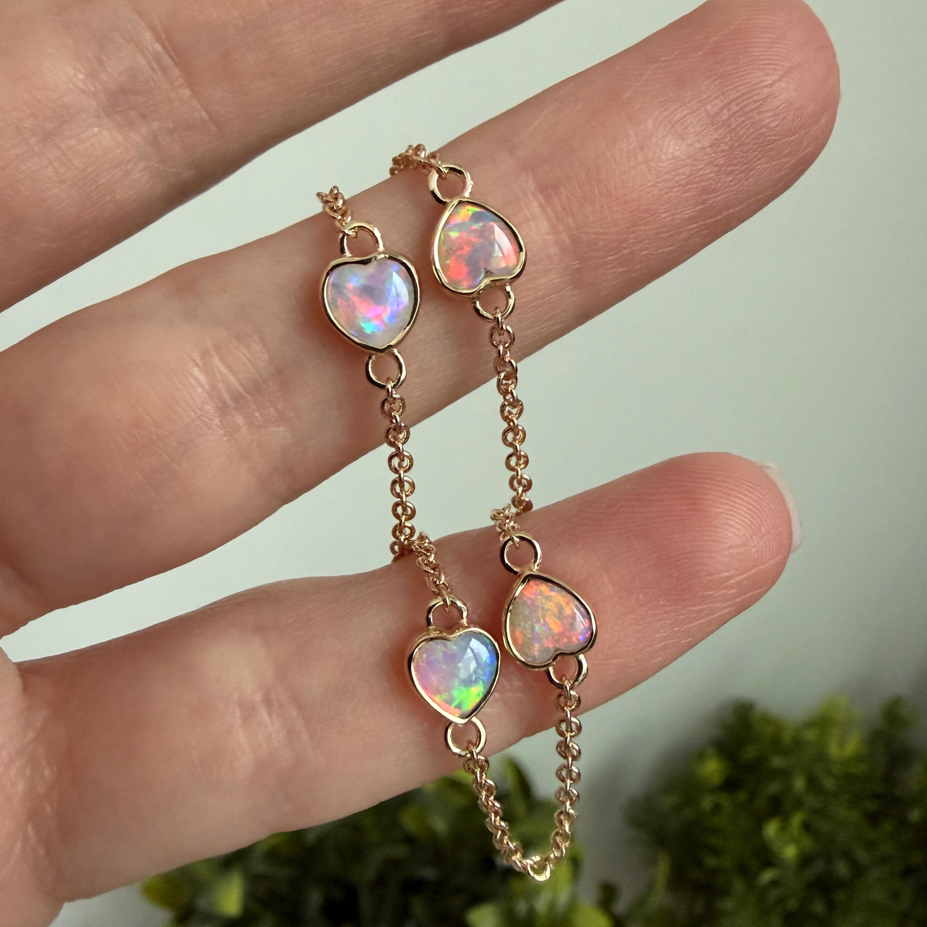 Please note: Each opal heart is unique. Your bracelet may vary slightly from the photos, but every stone will be bright, colorful, and with beautiful play-of-color.